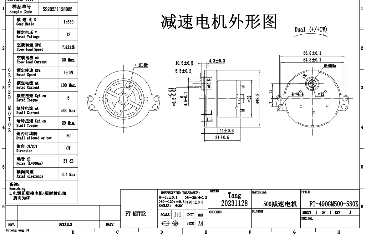 FT-49OGM500 DC Gear Motor for Automatic Feeder motor